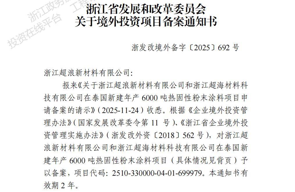 涂界记者12月8日获悉,浙江超海原料科技有限公司、浙江超浪新原料有限公司策画正在泰邦投资设立超浪新原料(泰邦)有限公司(ChallonAdvancedMaterials(Thailand)CompanyLimited),并从此者动作投资主体正在亚洲泰邦春武里府投资636.10万美元新修年产6000吨热固性粉末涂料项目,估计可杀青年生意收入约1.41亿元黎民币的范围。